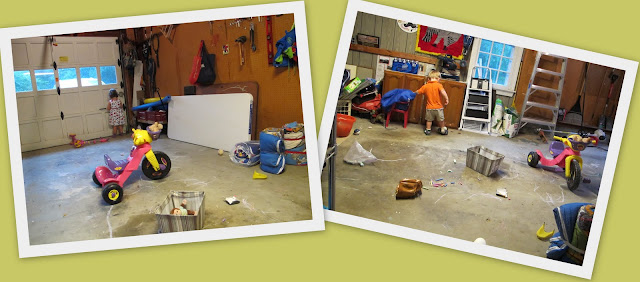 Another typical rainy day activity? Shutting the door to our tiny one car garage (that Will actually parks his even tinier Honda in) and playing with the outdoor toys—balls, bats, strollers, big wheels, scooters, sidewalk chalk, rakes and anything else they desire. As long as they keep it in the garage.