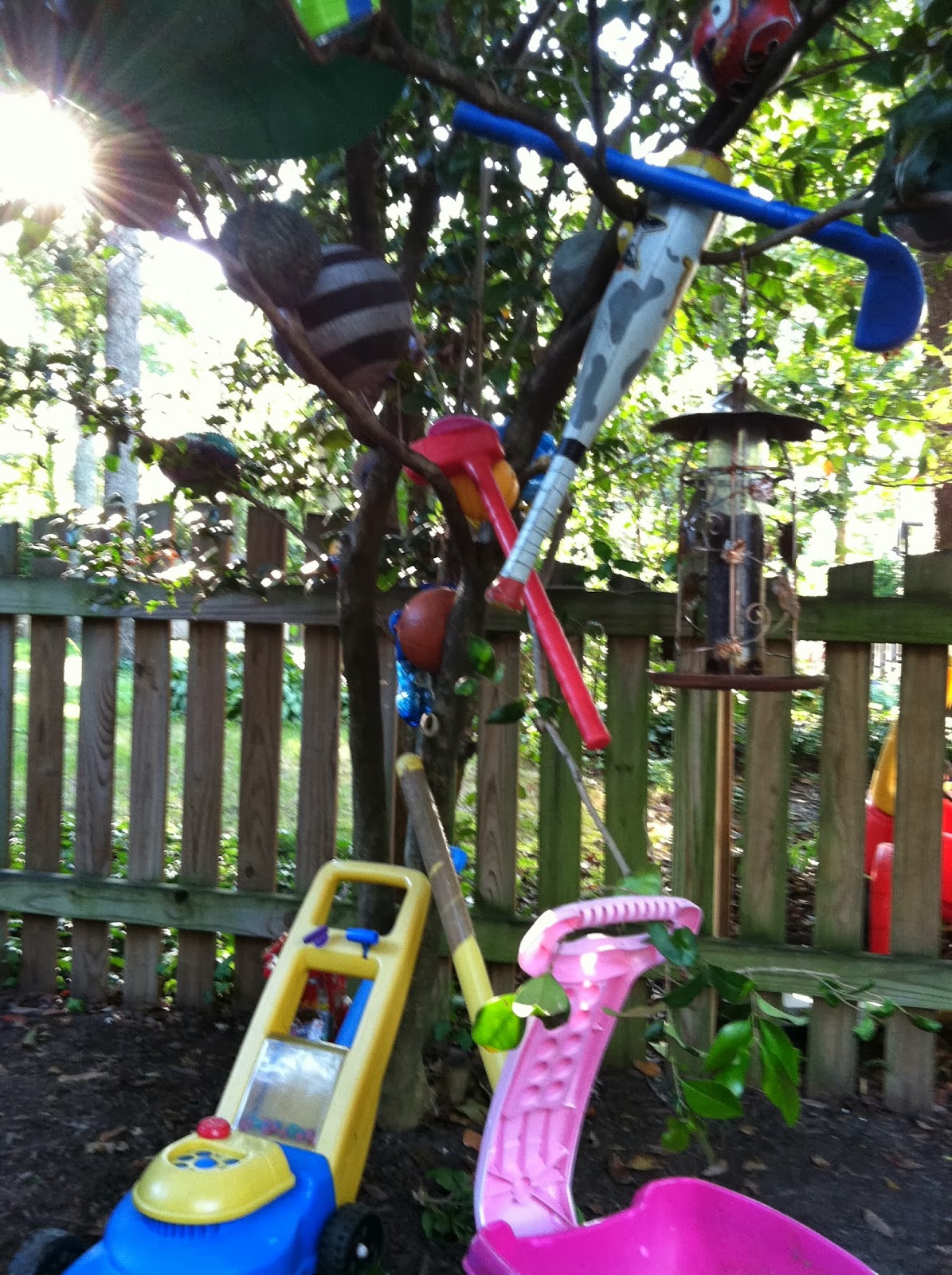 The tiniest tree in our yard holding every single play object. I had to laugh.